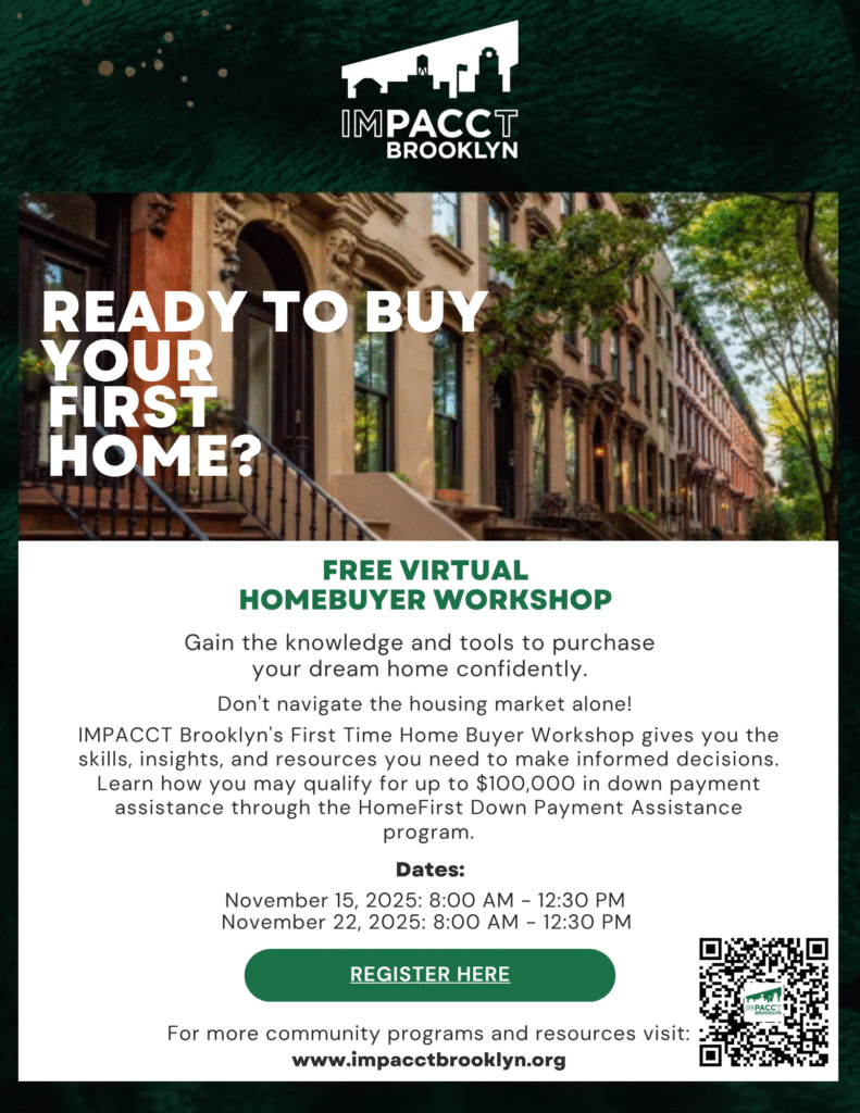 IMPACCT Brooklyn’s First Time Home Buyer Workshop is designed to help you gain the skills and knowledge you need to make informed decisions when buying a home. You can also learn how to obtain up to $100,000 in downpayment assistance from the Homefirst Down Payment Assistance program if you qualify!